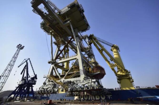 現(xiàn)場工作人員介紹,該設(shè)備長103米,寬31米,高60米,整機由廠家組裝完畢后用駁船運抵我港,在我港裝船運往阿聯(lián)酋。據(jù)悉,該設(shè)備以前運輸通常用駁船,在船與岸壁間鋪設(shè)軌道,通過機械外力使設(shè)備移至駁船上。該方法需要考慮海水潮汐等因素,存在一定的安全風險。為確保設(shè)備安全裝船,本次作業(yè)客戶選擇使用兩臺1500噸船吊配合作業(yè),將設(shè)備整機吊裝上船。