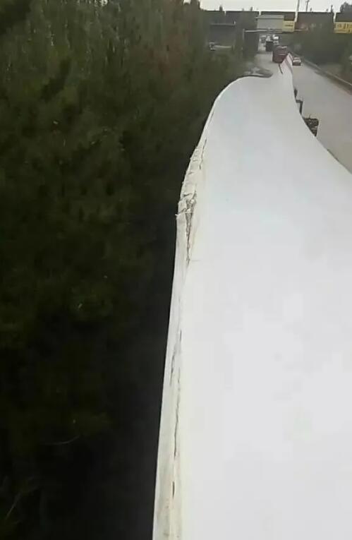 2020年1月9日在廣西賓陽武陵路口拐彎處,某大件運輸公司一輛葉片運輸車在運輸一扇50米風電葉途中,扇葉滑落,值得慶幸的是,只是擋住了整個路口,造成路過的車輛全部從武陵鎮(zhèn)里實施繞行,沒有其它重大損失。